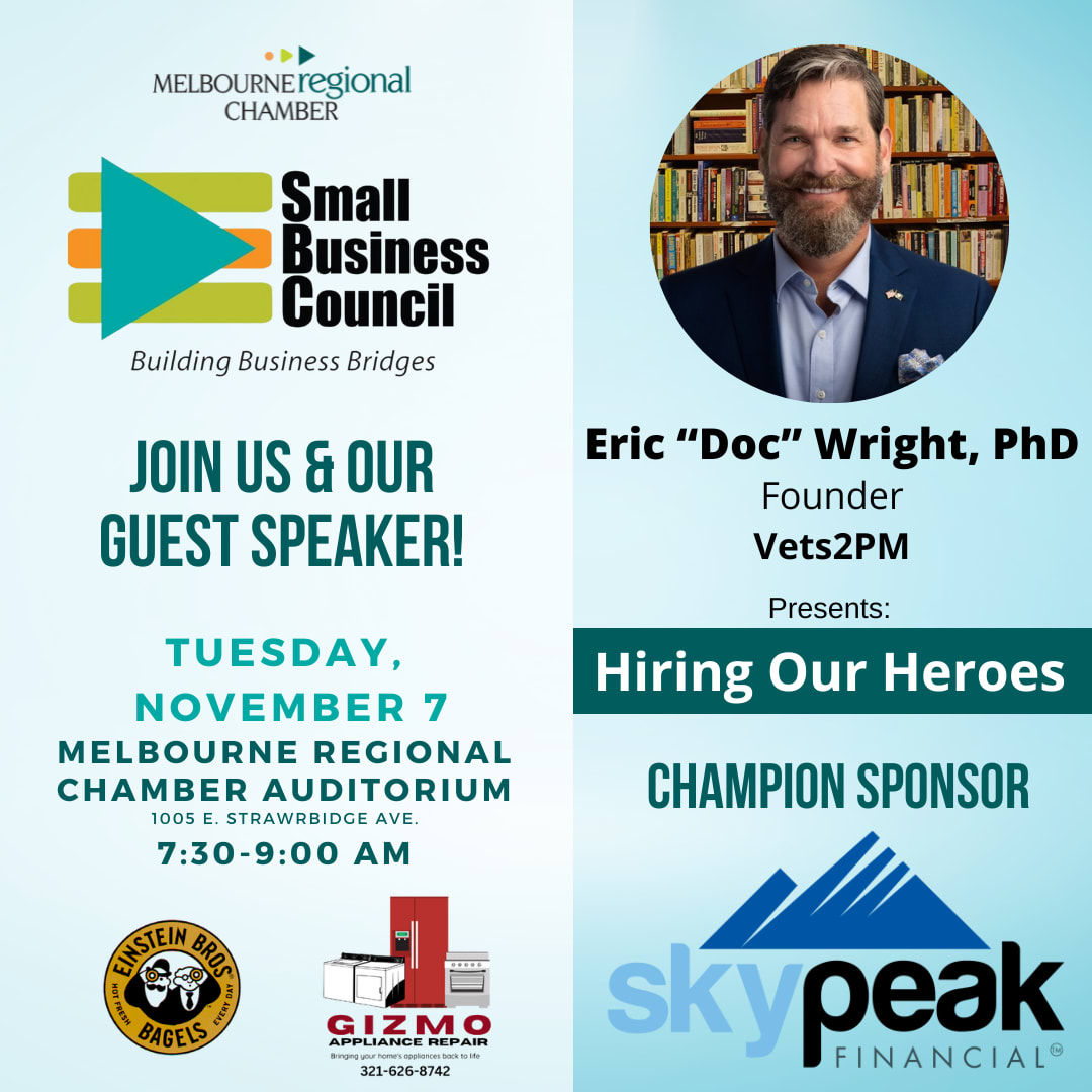 This Small Business Council meeting will feature Dr. Eric "Doc" Wright, a military veteran, serial entrepreneur, and author, addressing the topic of "Hiring Our Heroes." This presentation will combine his unique military and business background, wisdom, and passion for financial freedom to inspire attendees to explore innovative ways to support veterans while benefitting their own businesses.