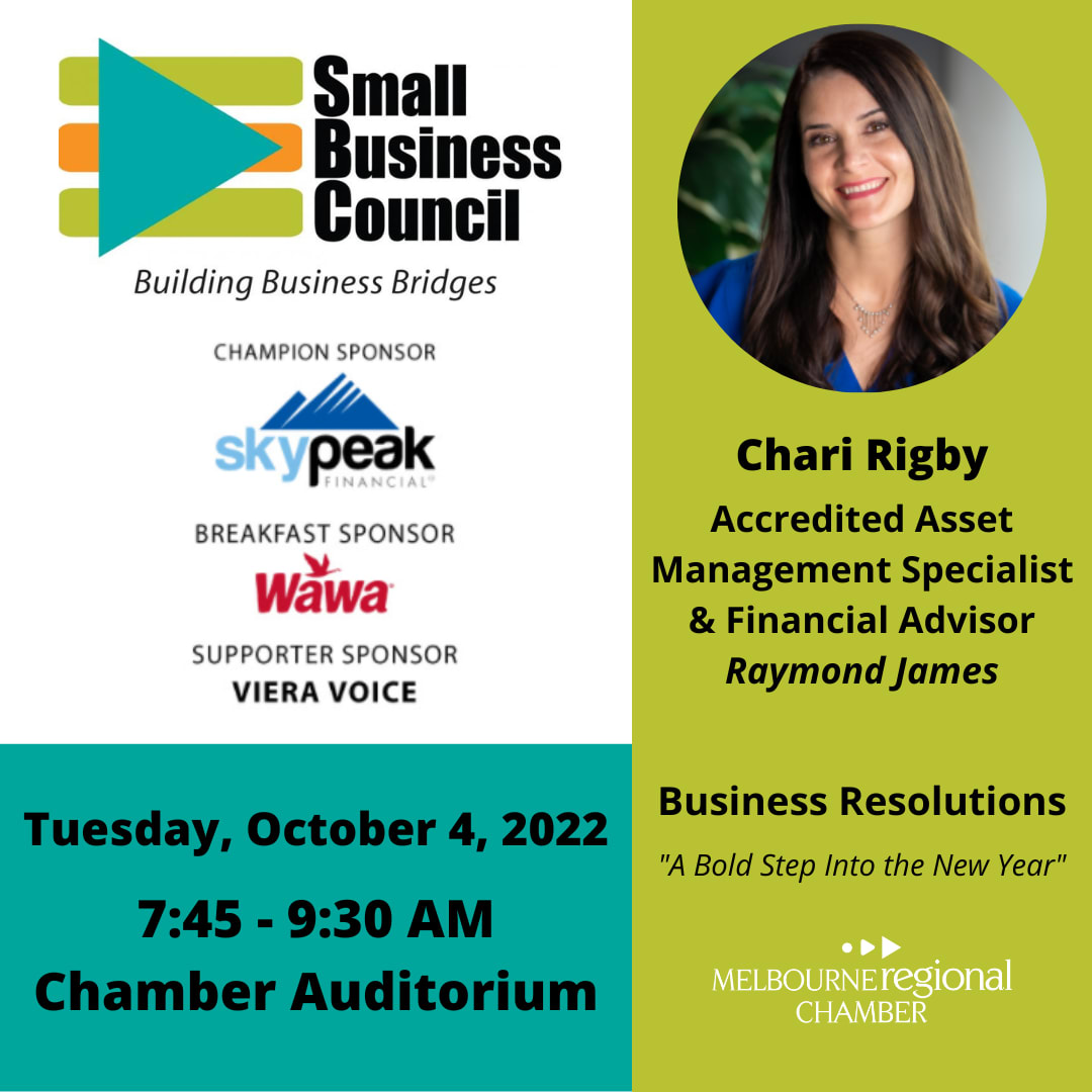 Join our Small Business Council for "A Bold Step Into the New Year" as we hear from guest speaker, Chari Rigby, Accredited Asset Management Specialist and Financial Advisor at Raymond James.