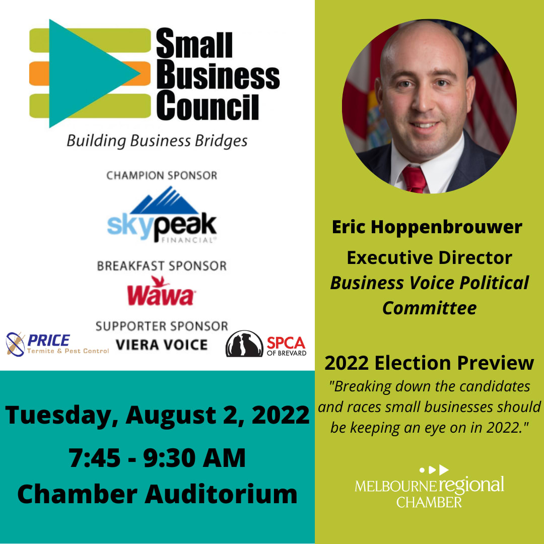 Join our Small Business Council for a 2022 Election Preview. Hear from keynote speaker, Eric Hoppenbrouwer, Executive Director of Business Voice Political Committee.
