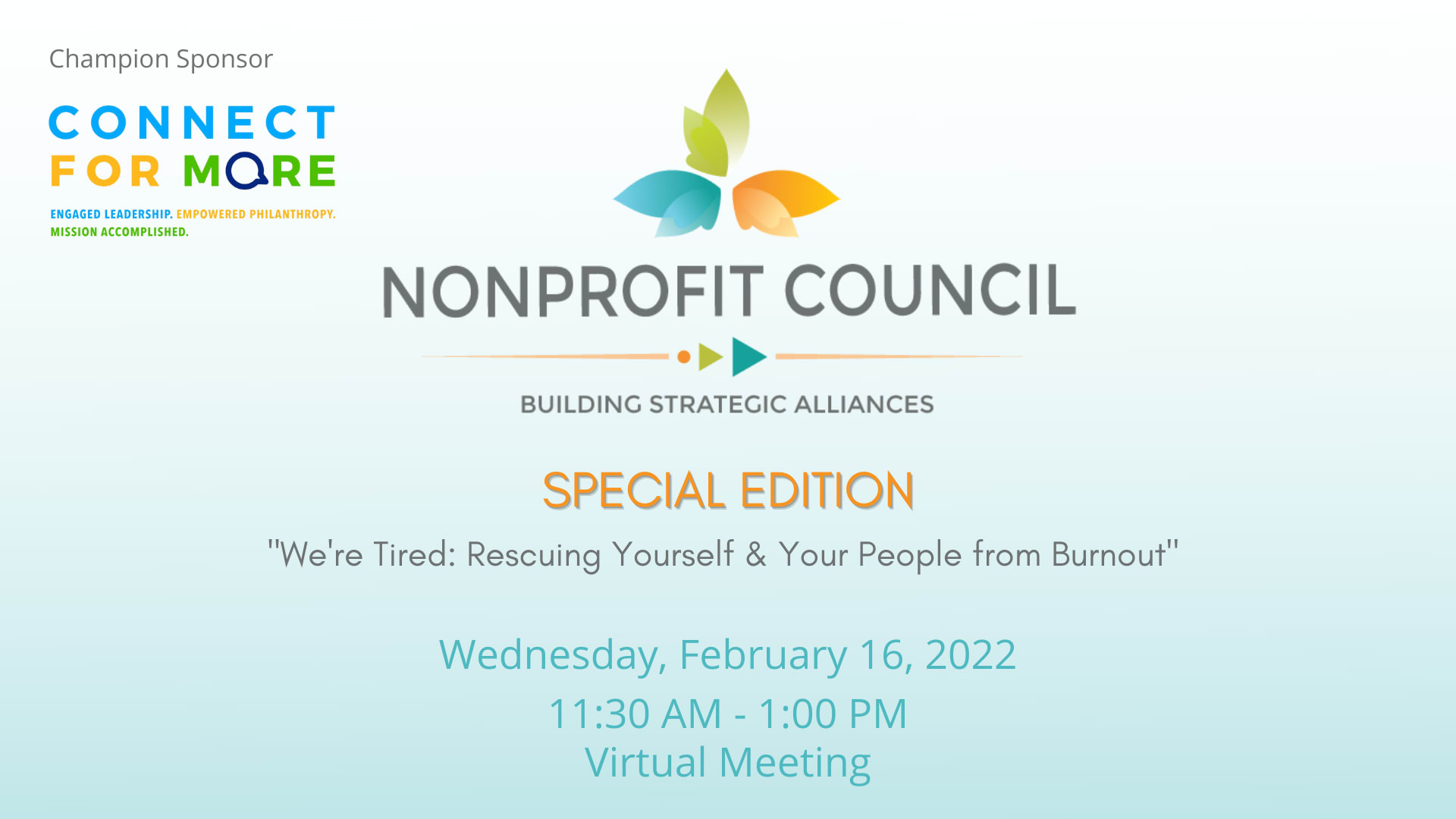 We're proud to bring you this panel of experts who'll share their own leadership journeys, pandemic challenges & silver linings, as well as provide inspiration on caring for yourself and your staff ALL while stewarding your mission work. This session will feature executive, consultant and volunteer leaders from around our state and will be moderated by TedX speaker and fourth-generation Floridian Liz Wooten-Reschke. This inspiring and real-world view on the struggles and triumphs of nonprofit business in the new abnormal is brought to you in partnership with Florida-based consulting firm Connect For More.